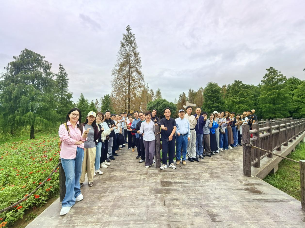 上午,在导游的带领下,大家先来到青浦的青西郊野公园,这是上海市唯一以湿地为特色的郊野公园。公园内的“水上森林”以池杉等耐水湿树种为主,百亩池杉林如诗如画,水域清澈见底,水中的鱼儿自由自在地游弋,木质栈道蜿蜒其间。教师们呼吸着清新的空气,在怡人的秋景中漫步畅谈,时不时取景拍照,将美景与情谊定格为永恒记忆。