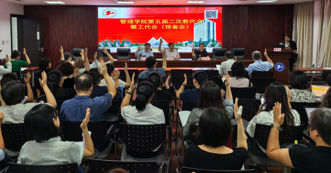 2025年10月14日至21日,管理学院五届二次教代会暨工代会在行政楼906会议室顺利召开。学院党政领导、正式代表齐聚一堂,共商学院发展大计。会议由学院党委书记范君晖主持。围绕“三旋翼”交叉融合驱动的学科发展路径,全院正奋力拓优势、提实力,本次会议是建设世界一流的应用创新型经济管理学院关键时期召开的一次重要会议。