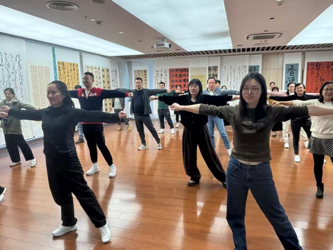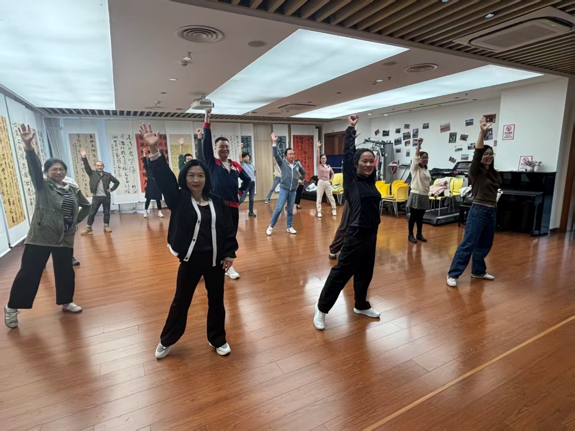 此次活动的深层内涵,在于其巧妙呼应了“顺时而动”的中国传统养生文化精髓。结合现代健美操与古法养生功法的创新形式,在动感的节奏中,融入了太极的圆活舒展、八段锦的抻筋拔骨、五禽戏的仿生导引等元素,使得运动超越了单纯的肌肉锻炼层面,上升为一种“形神兼备”的修炼。在简单易学又灵动多变的动作中,老师们不仅活动了筋骨,更在意念的引导、呼吸的配合中,实现了精神的专注与放松,达到了调身、调息、调心的统一,身体和精神在运动中得到滋养。
