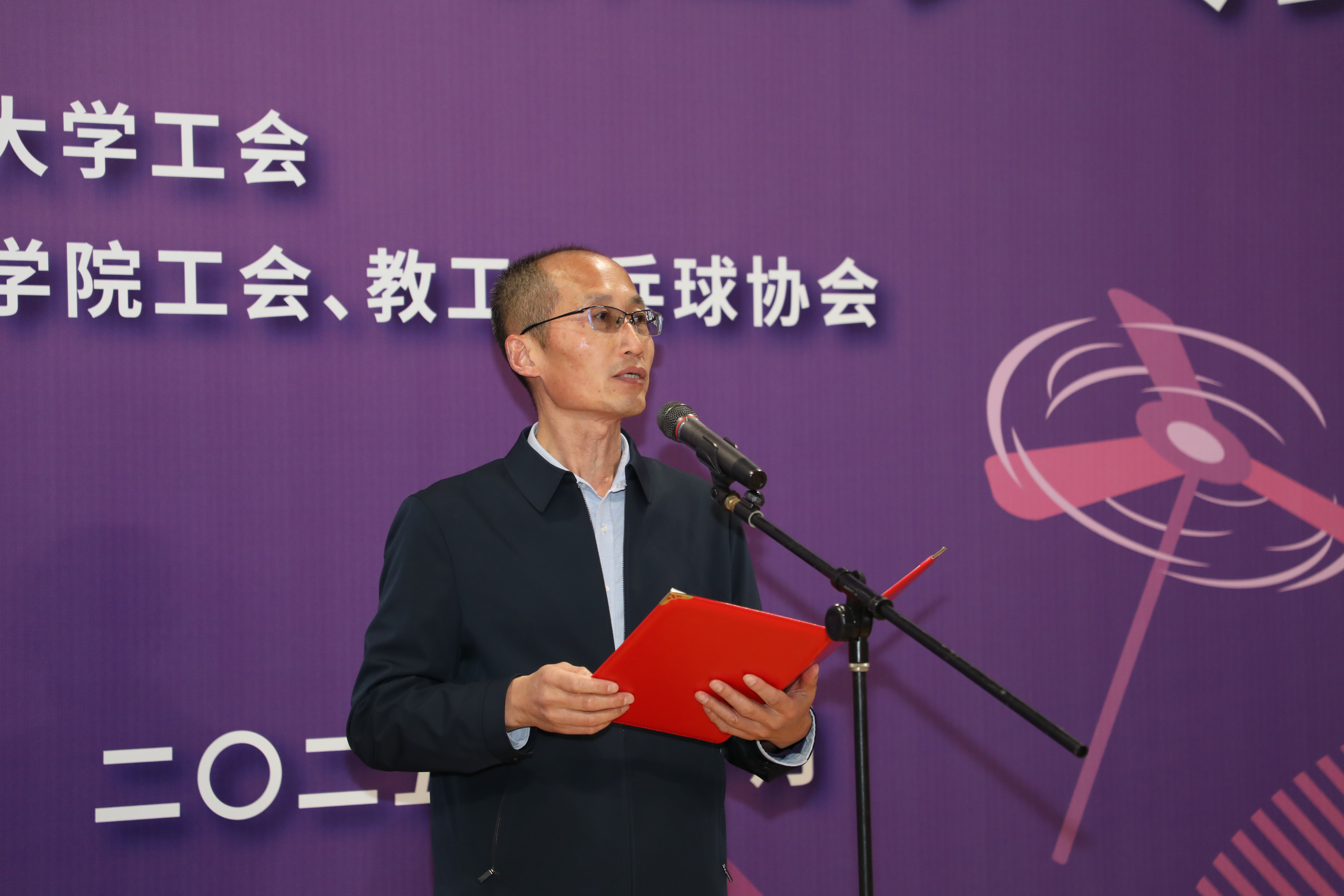 开幕式上,朱书记指出,本次赛事不仅是竞技的舞台,更是“三旋翼”战略落地的实践场。我们要以奥林匹克精神中的“更快、更高、更强、更团结”为引领,让每一场对决都成为跨学科交流的契机。朱书记讲到,今天的赛场,既是展现个人风采的舞台,更是凝聚集体智慧的熔炉。希望大家通过这场赛事,不仅收获健康的体魄,更能激发出跨学科创新的灵感——让工程技术的严谨、管理协同的智慧、设计美学的创意在球桌两端交融共生,为建设具有鲜明产业特色的世界一流应用创新型大学注入磅礴动能。