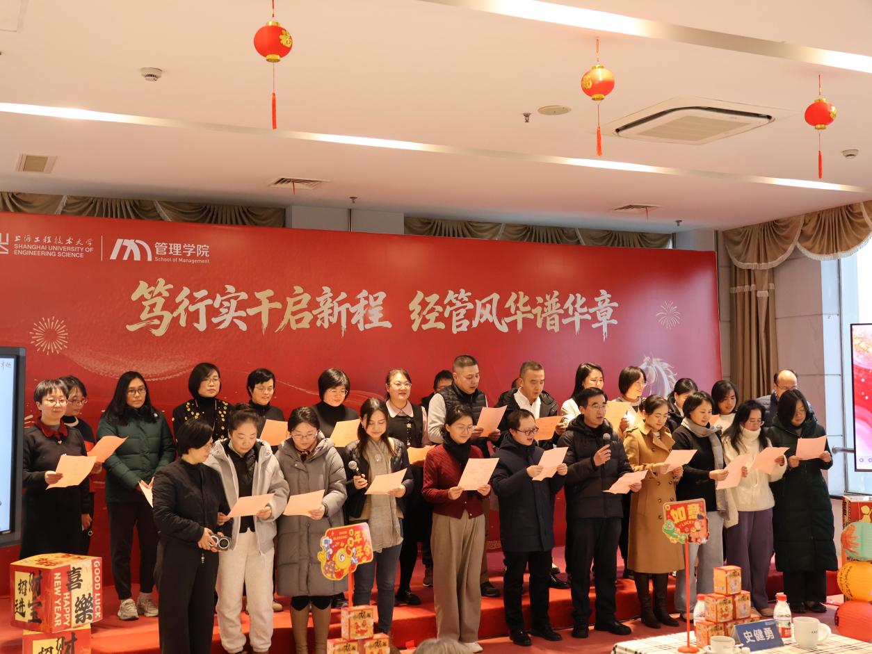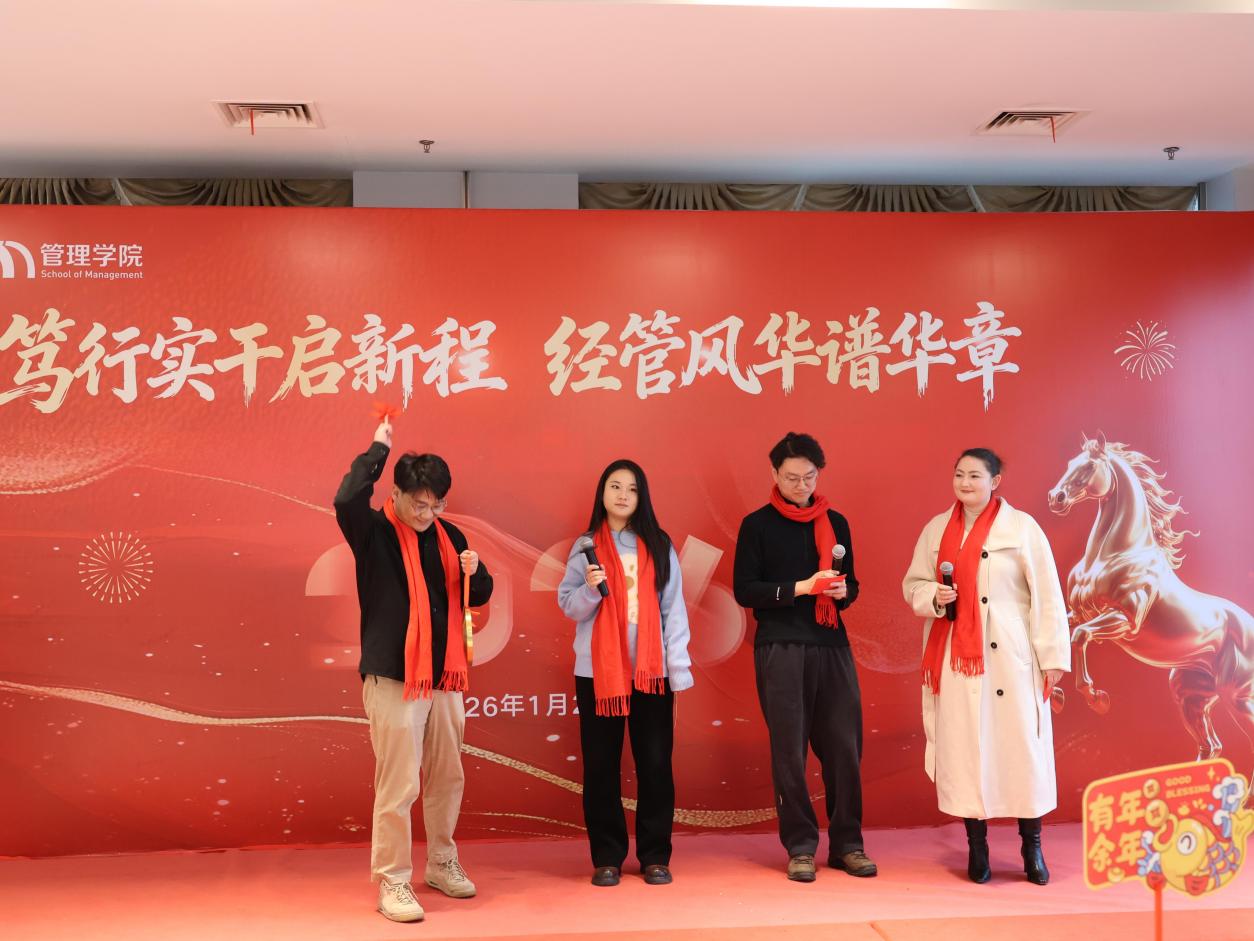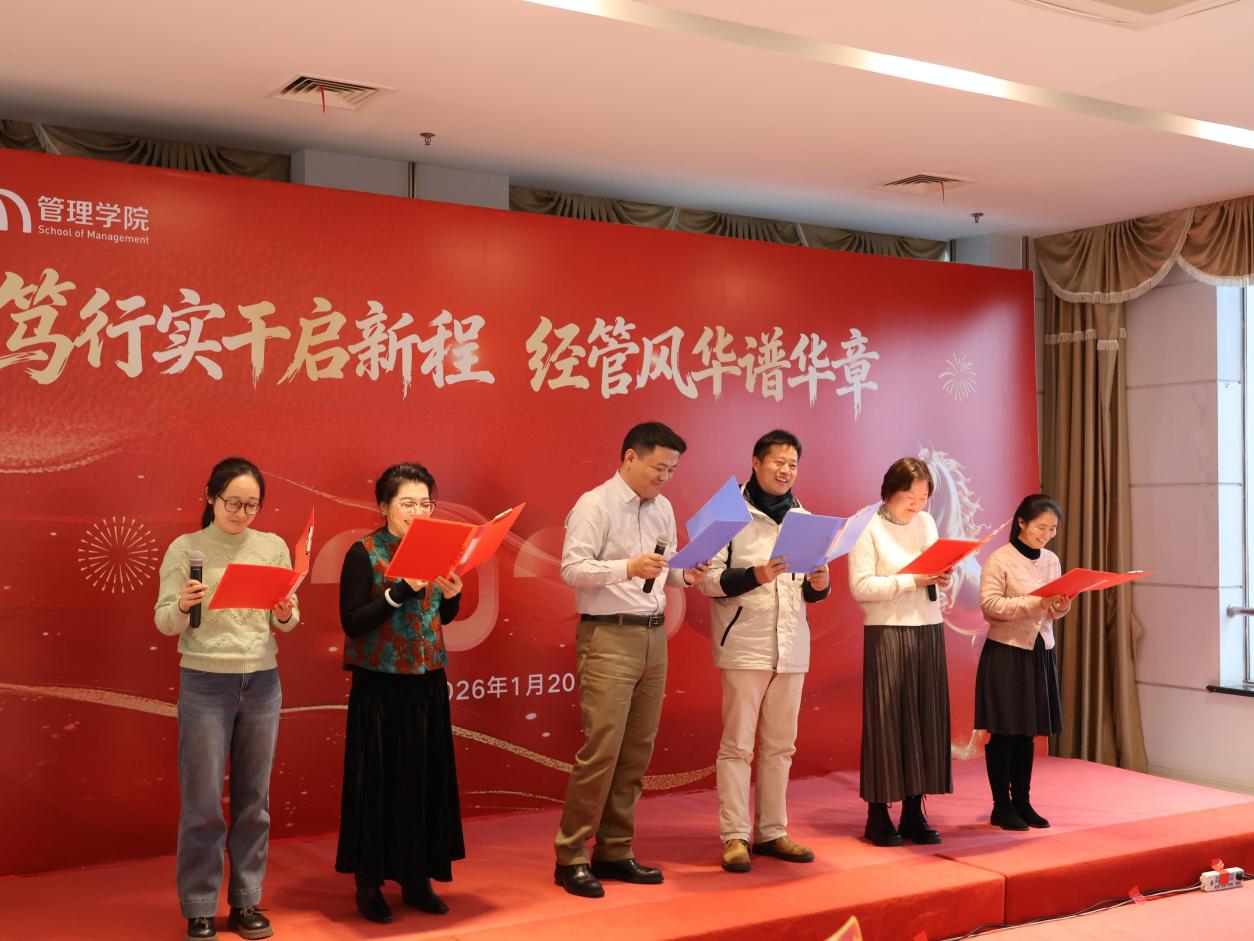 1月20日,一场以“笃行实干启新程,经管风华谱华章”为主题的2026年迎新联欢会在行政楼19楼举行。管理学院党政领导、全体教职工近200人出席了本次联欢会。