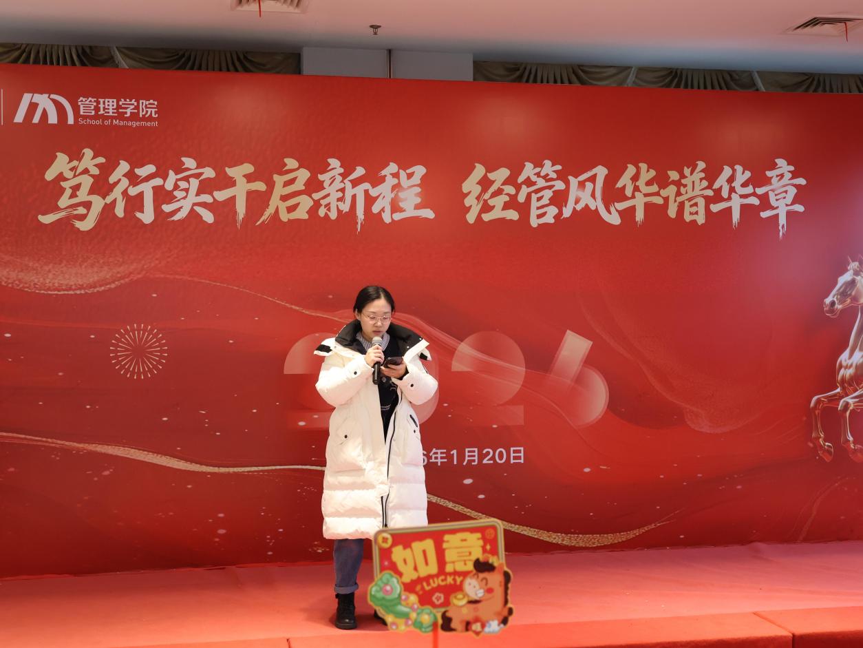 联欢会在温馨而热烈的氛围中拉开序幕。管理学院胡斌院长发表了热情洋溢的开场致辞,特别介绍了近两年加入学院的新成员,他们怀揣着教育理想,为学院注入了新的活力与激情。