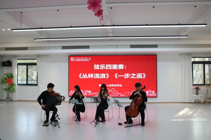 第二篇章“马到功成・续新章”多元纷呈。上音学生的弦乐四重奏《丛林流浪》《一步之遥》搭建文化桥梁;习概论教研室教师演唱《樱花草》柔美舒缓,影视配音《武林外传》引爆笑点。上音学生的女声独唱《还有什么更好的》征服观众,互动游戏与抽奖让气氛持续升温。
