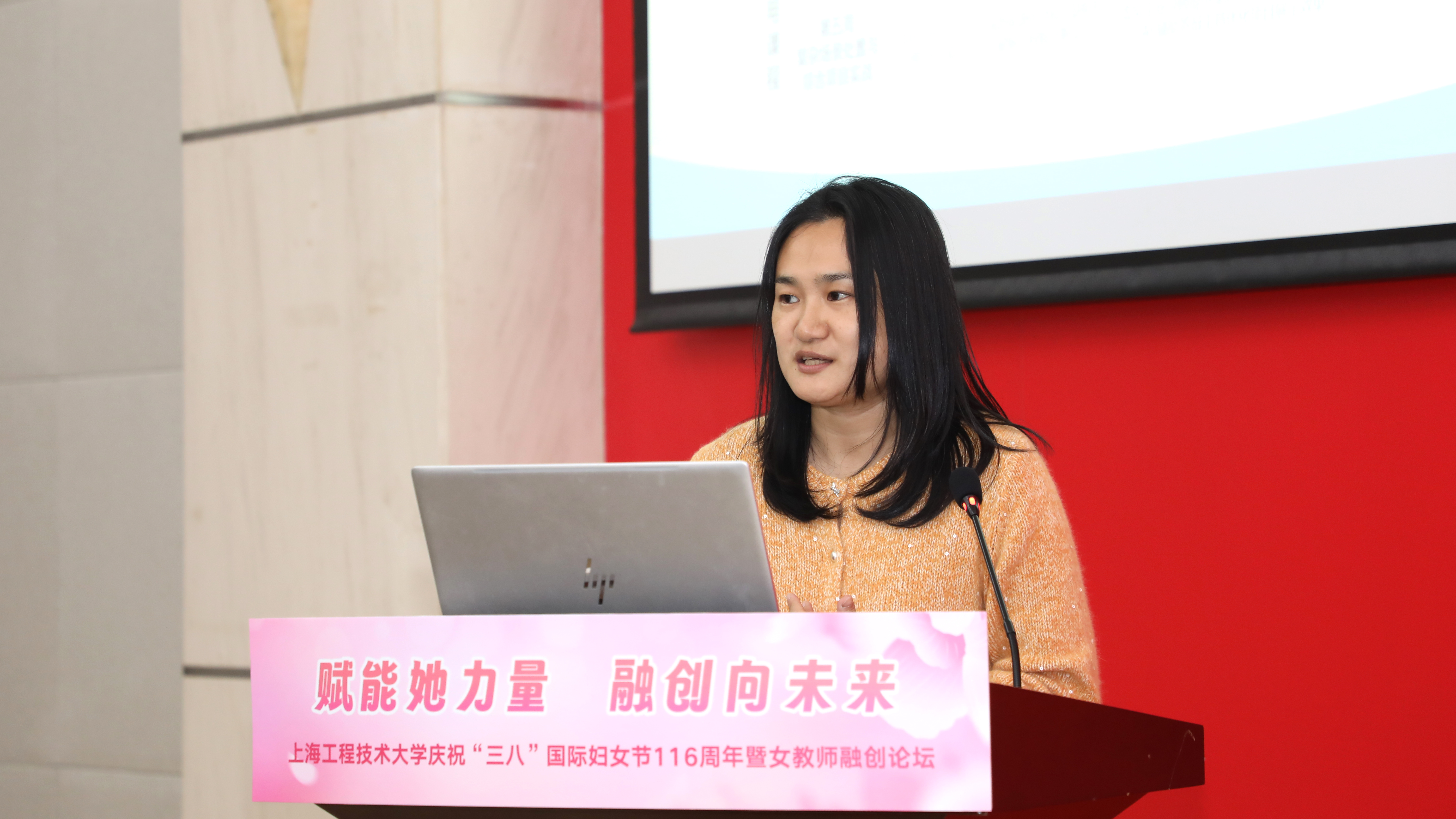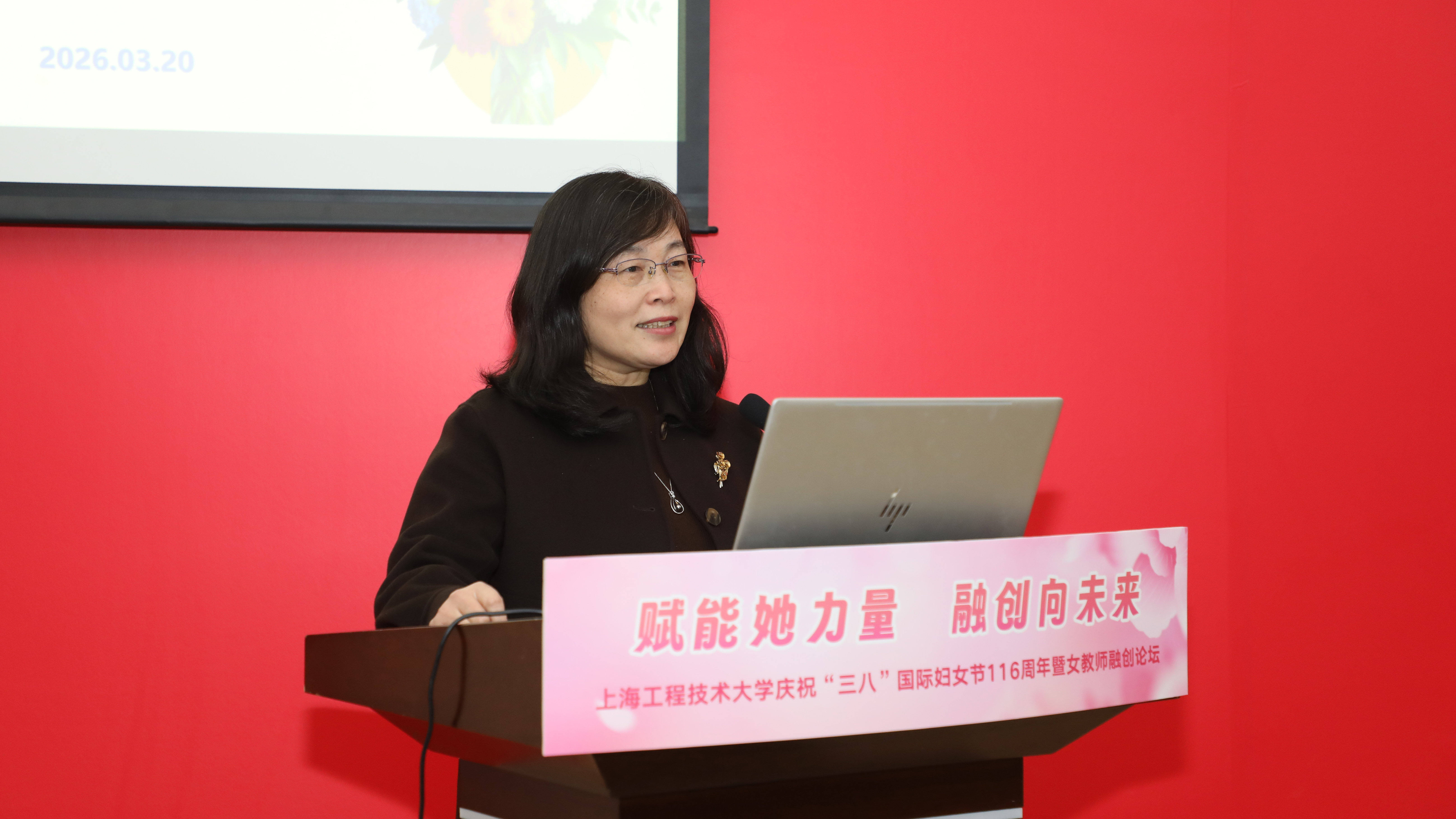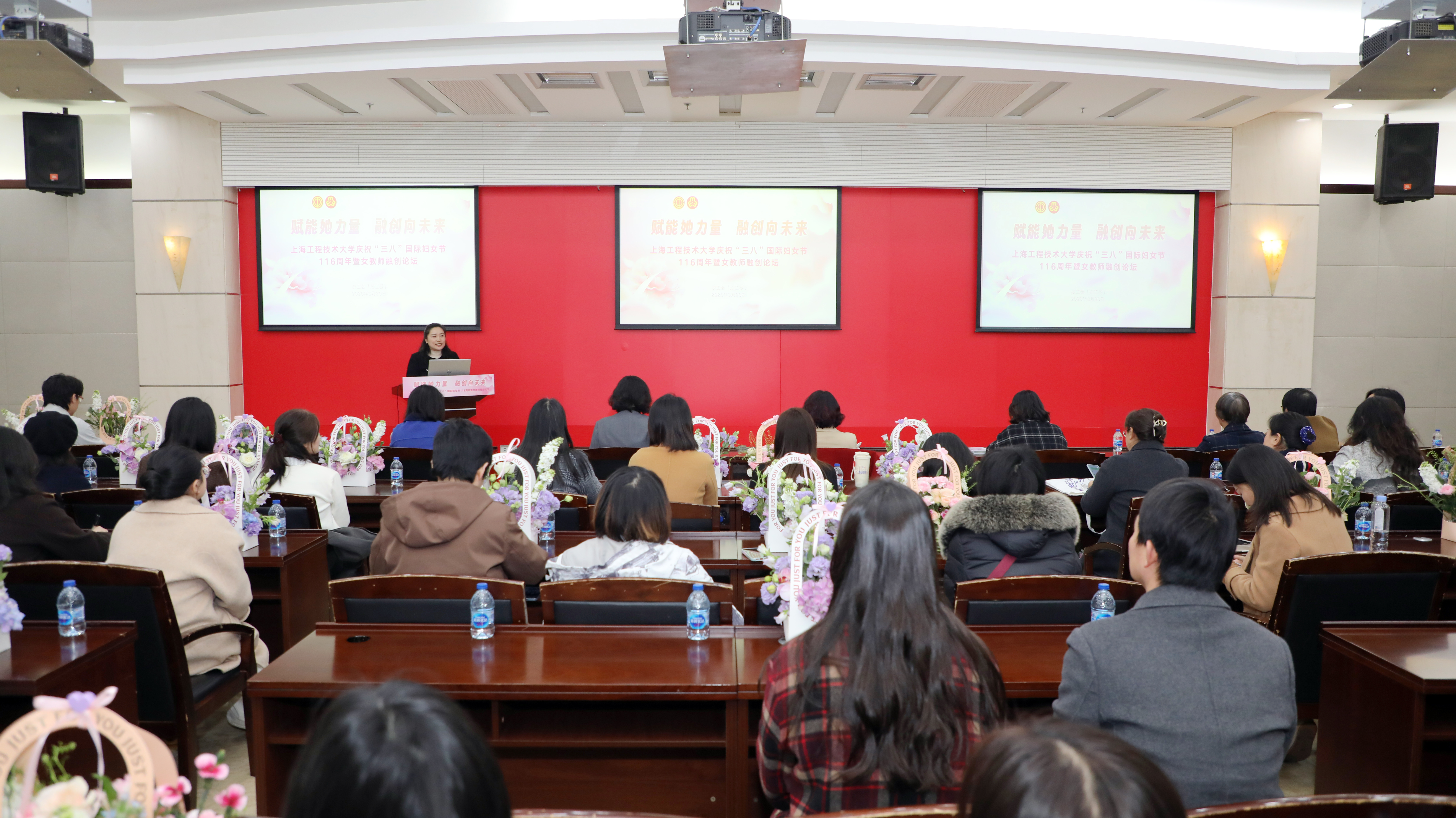 春和景明程园秀,巾帼筑梦融创兴。为进一步推动融合创新、促进学科发展、汇聚巾帼智慧,3月20日下午,我校在图文信息中心第三报告厅举办“赋能她力量 融创向未来”庆祝“三八”国际妇女节116周年暨女教师融创论坛。校党委副书记、工会主席、妇工委主任朱晓青,副校长许开宇,职能部处和院部负责人代表,女教授、女干部联谊会代表,教师代表及女大学生代表参加活动。活动由机械与汽车工程学院教授、上海市女优青联谊会副秘书长朱姿娜老师主持。