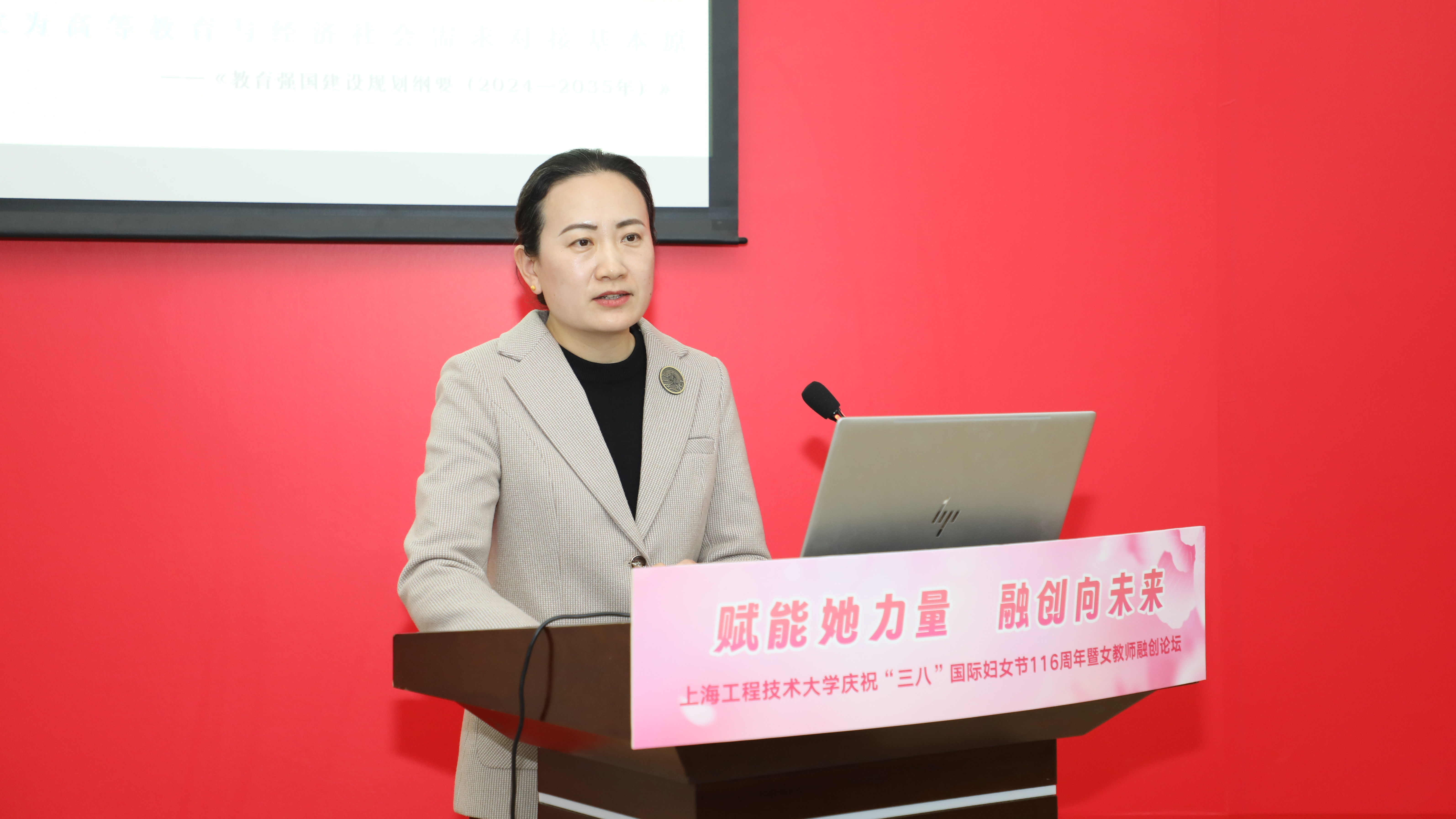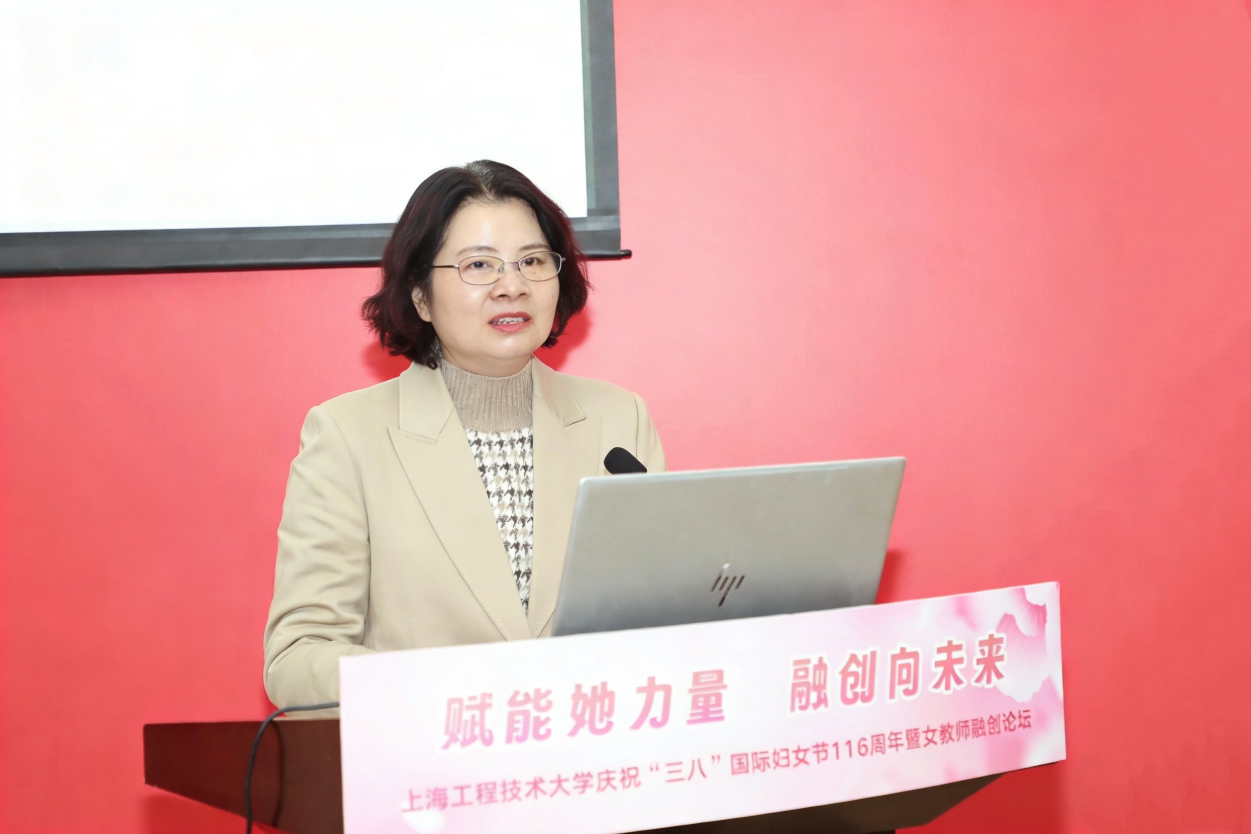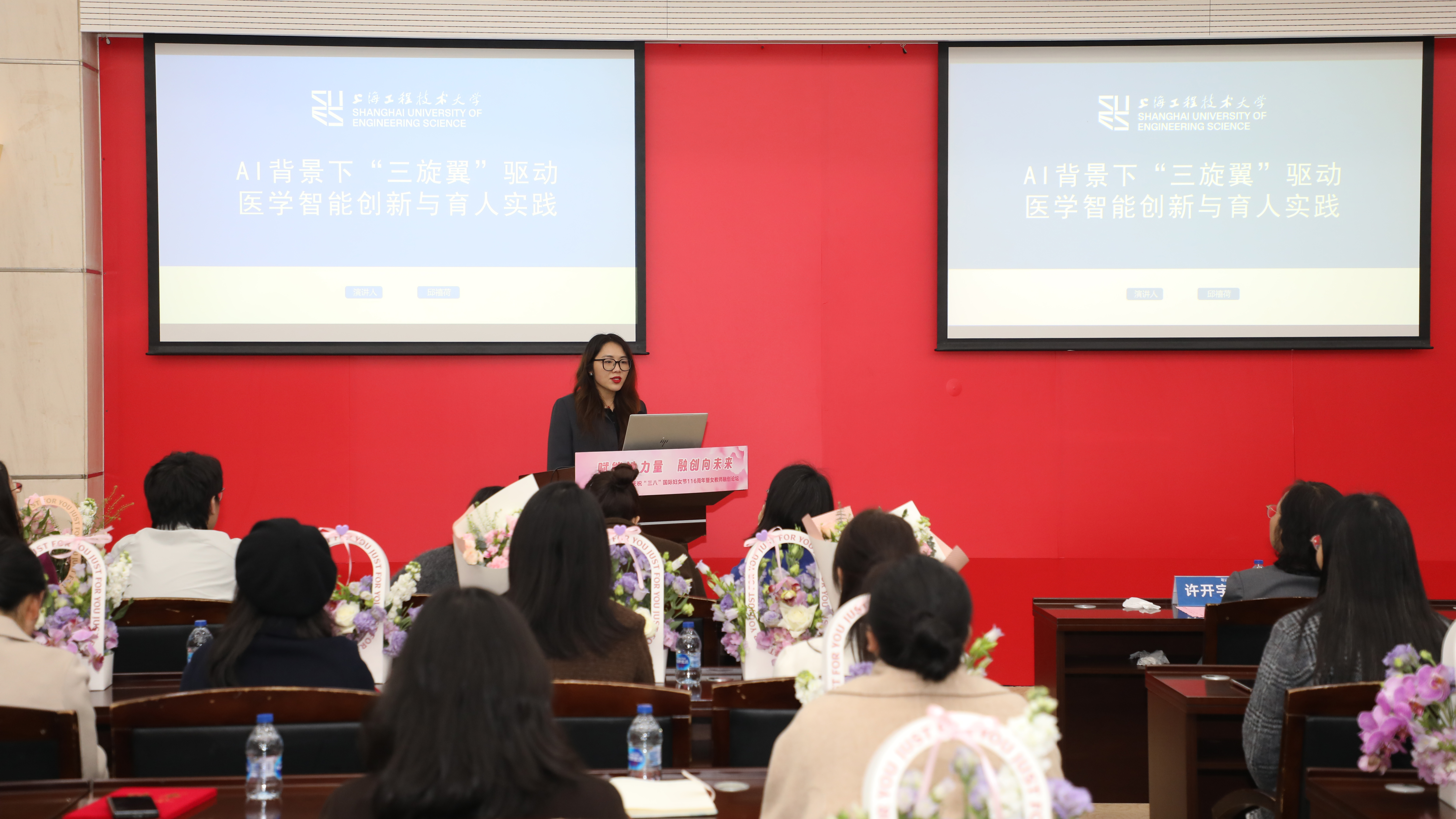 春和景明程园秀,巾帼筑梦融创兴。为进一步推动融合创新、促进学科发展、汇聚巾帼智慧,3月20日下午,我校在图文信息中心第三报告厅举办“赋能她力量 融创向未来”庆祝“三八”国际妇女节116周年暨女教师融创论坛。校党委副书记、工会主席、妇工委主任朱晓青,副校长许开宇,职能部处和院部负责人代表,女教授、女干部联谊会代表,教师代表及女大学生代表参加活动。活动由机械与汽车工程学院教授、上海市女优青联谊会副秘书长朱姿娜老师主持。
