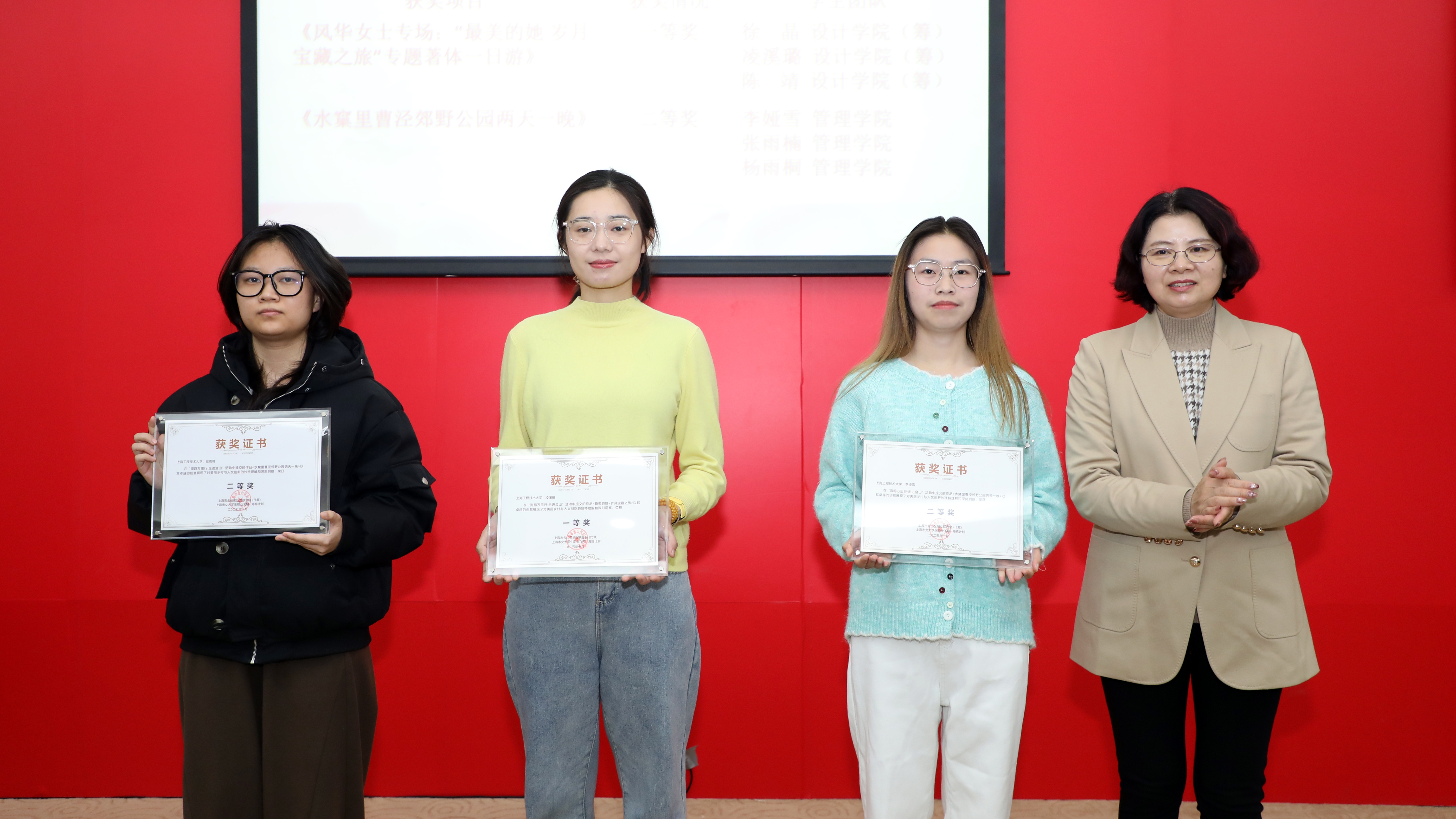 校党委副书记朱晓青为荣获教育系统、校比翼双飞模范佳侣(标兵)及“海鸥万里行·走进金山”文旅项目获奖团队代表颁奖。