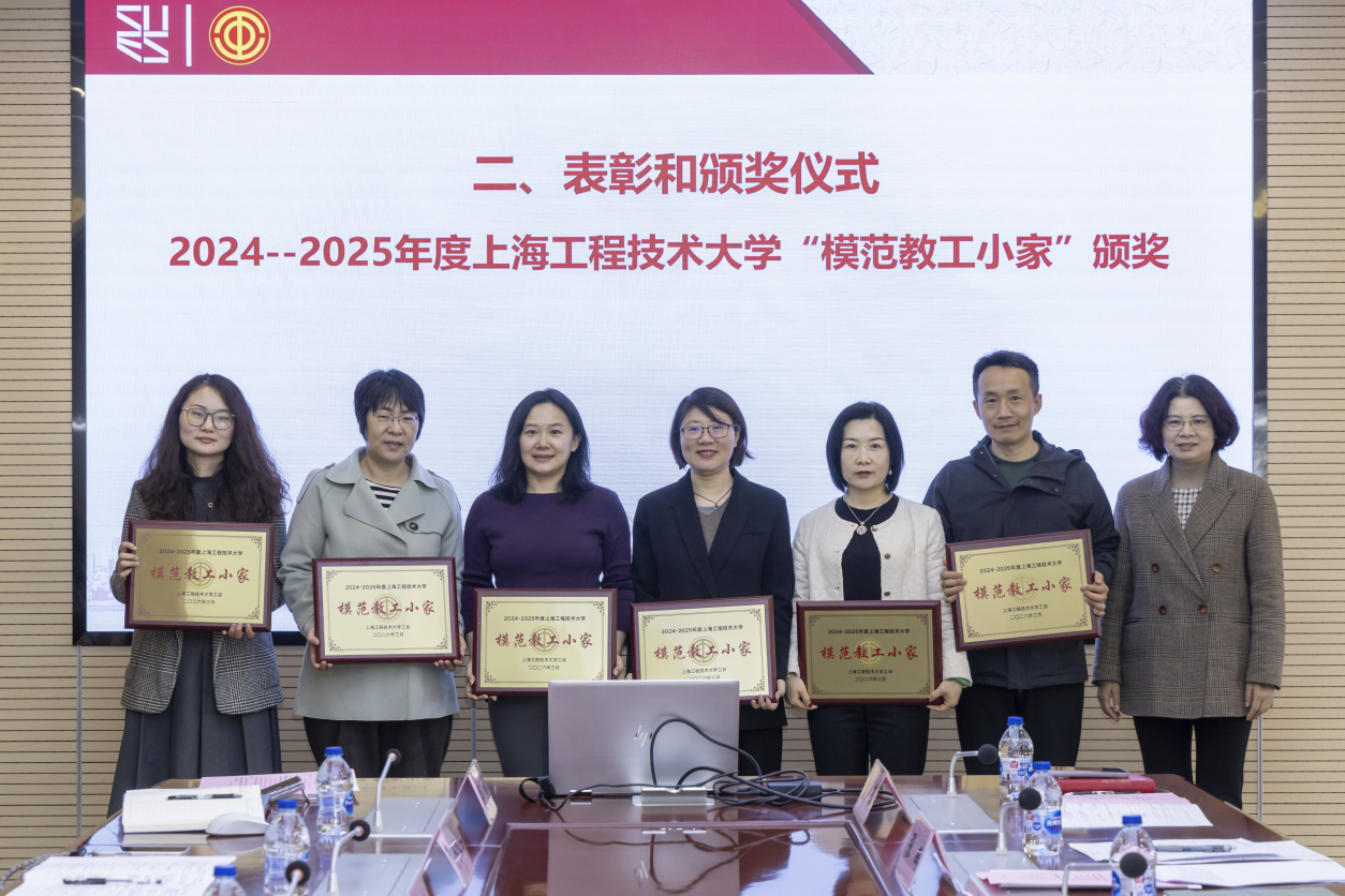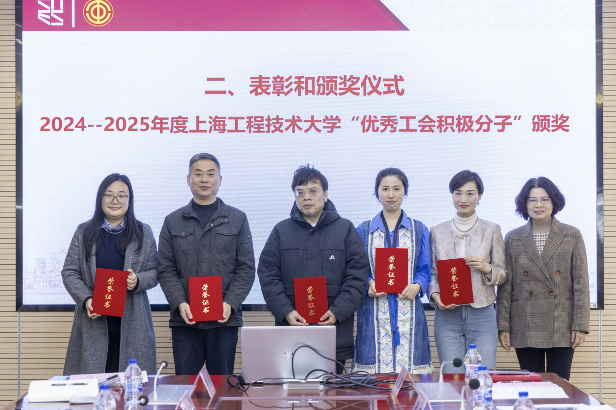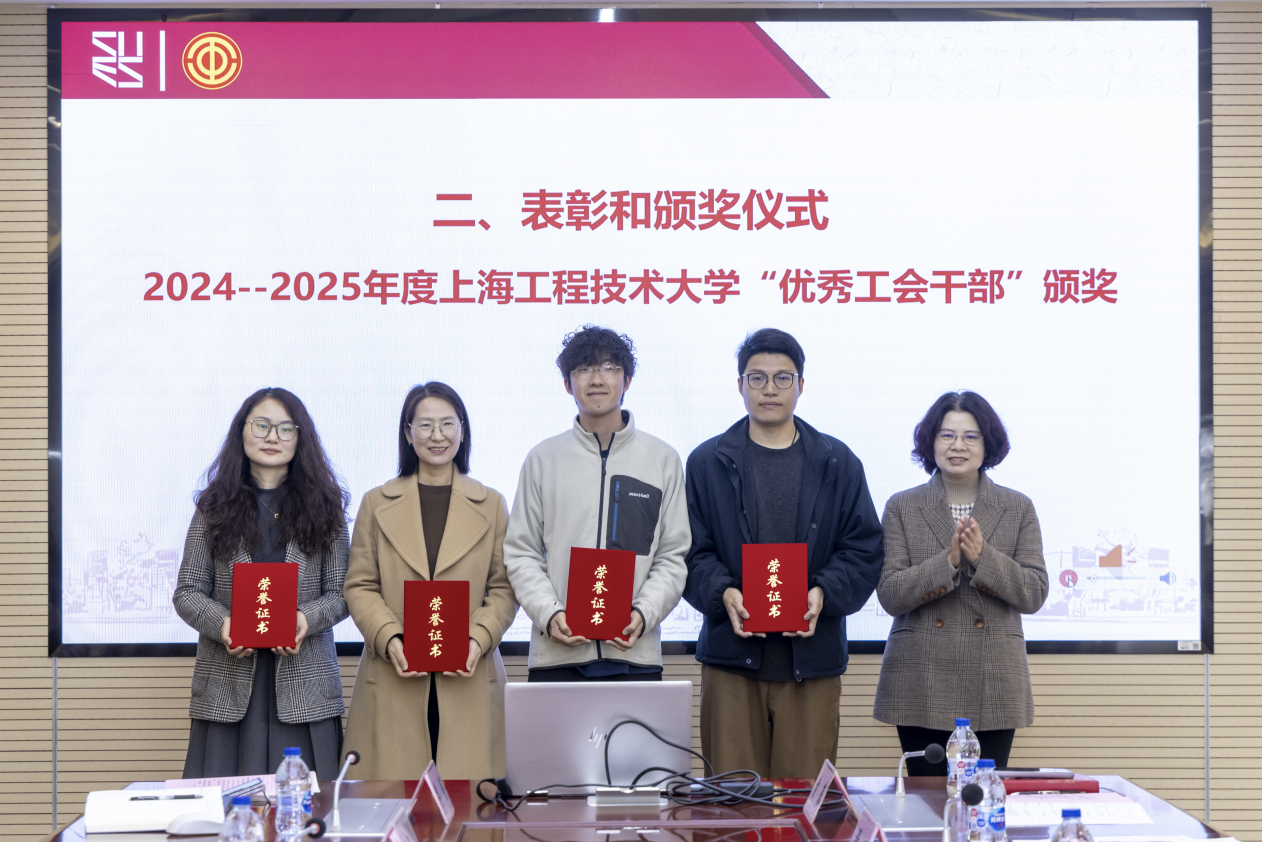 朱晓青为荣获2024-2025年度上海工程技术大学“模范教工小家”“优秀工会干部”“优秀工会积极份子”荣誉称号的部门工会和个人代表颁奖。